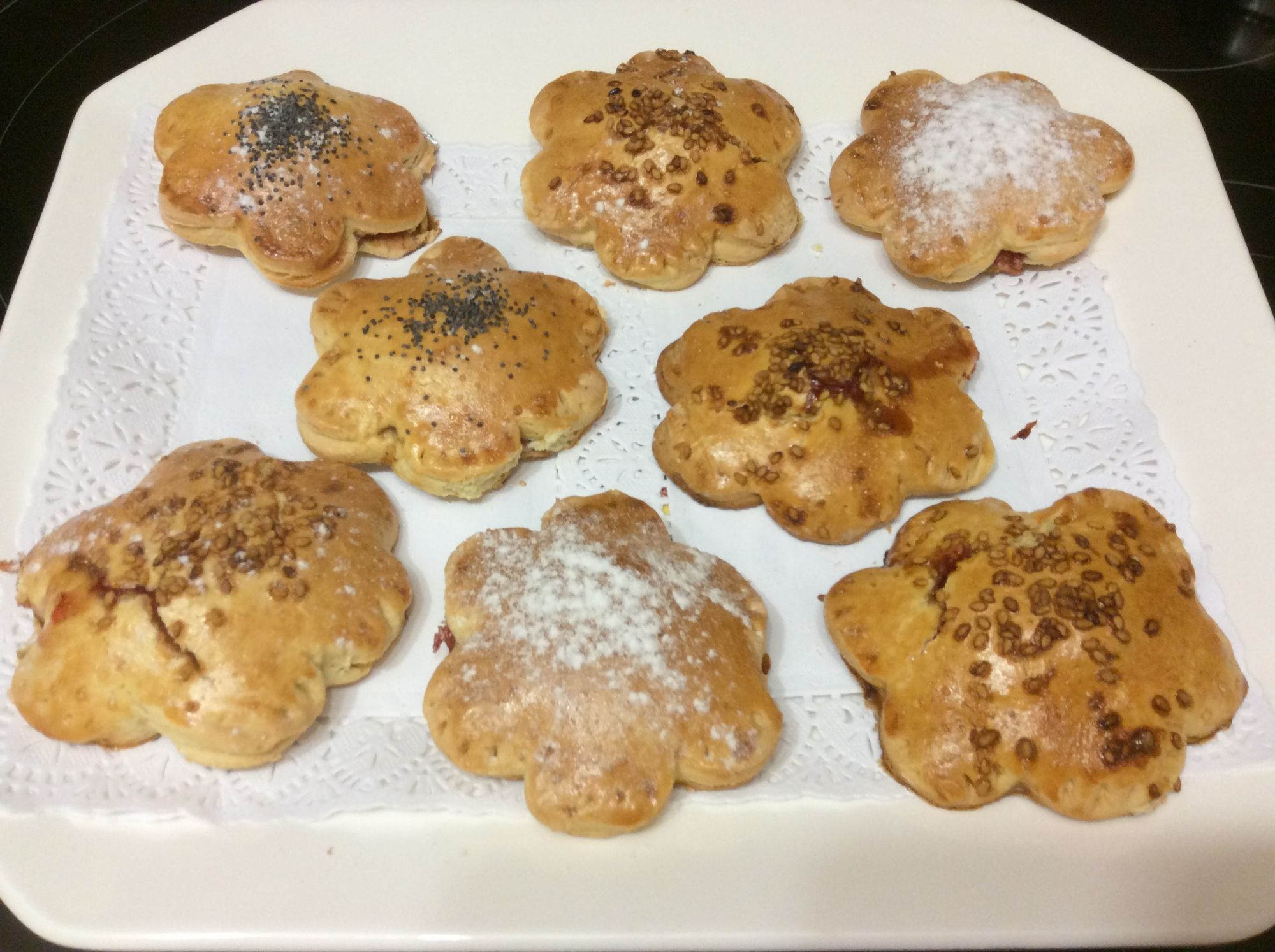Pintar con huevo batido, espolvorear si se desea con semillas de amapola, sésamo, etc y hornear a 200°C durante 15 minutos.