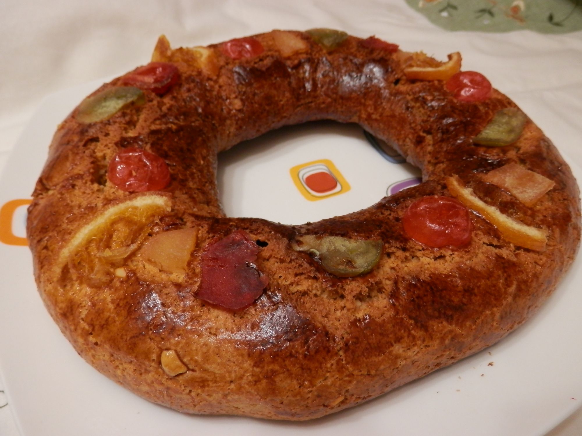 Hacer una bola con la masa y colocarla sobre un papel de cocinar en la bandeja del horno. Hacer un agujero en el centro e ir dándole forma de roscón. Decorar por encima con el resto de fruta confitada.