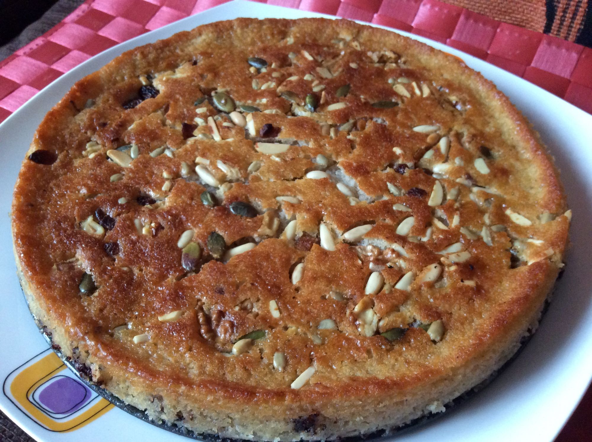 Enharinar un molde o untarlo de mantequilla y verter la masa. decorar con algunos frutos secos por encima y los piñones.
