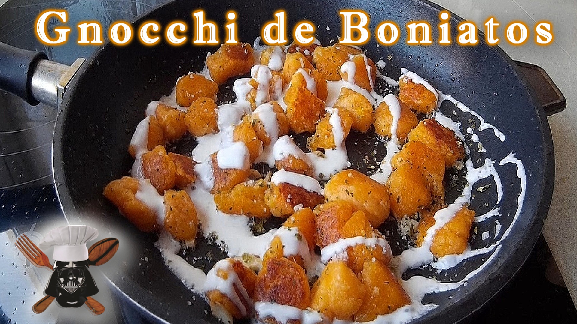 Para finalizar el plato, vamos a coger una sarten Antiadherente, le añadimos aceite y mantequilla y cuando esta se funda le incorporamos los ñoquis de boniato, los salteamos un poco y le agregamos ajos picados muy finos, dejando cocinar hasta que cojan un color dorado. Para acabar el plato añadimos las especias que mas nos gusten y para terminar la incorporamos un poco de nata de cocinar.