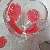 Con la ayuda de cortadores de galletas o similar haremos flores o cualquier otra forma que os guste. Los pegaremos delicadamente en las paredes interiores de las copas o vasos. ( ya veréis que la gelatina se queda pegada)