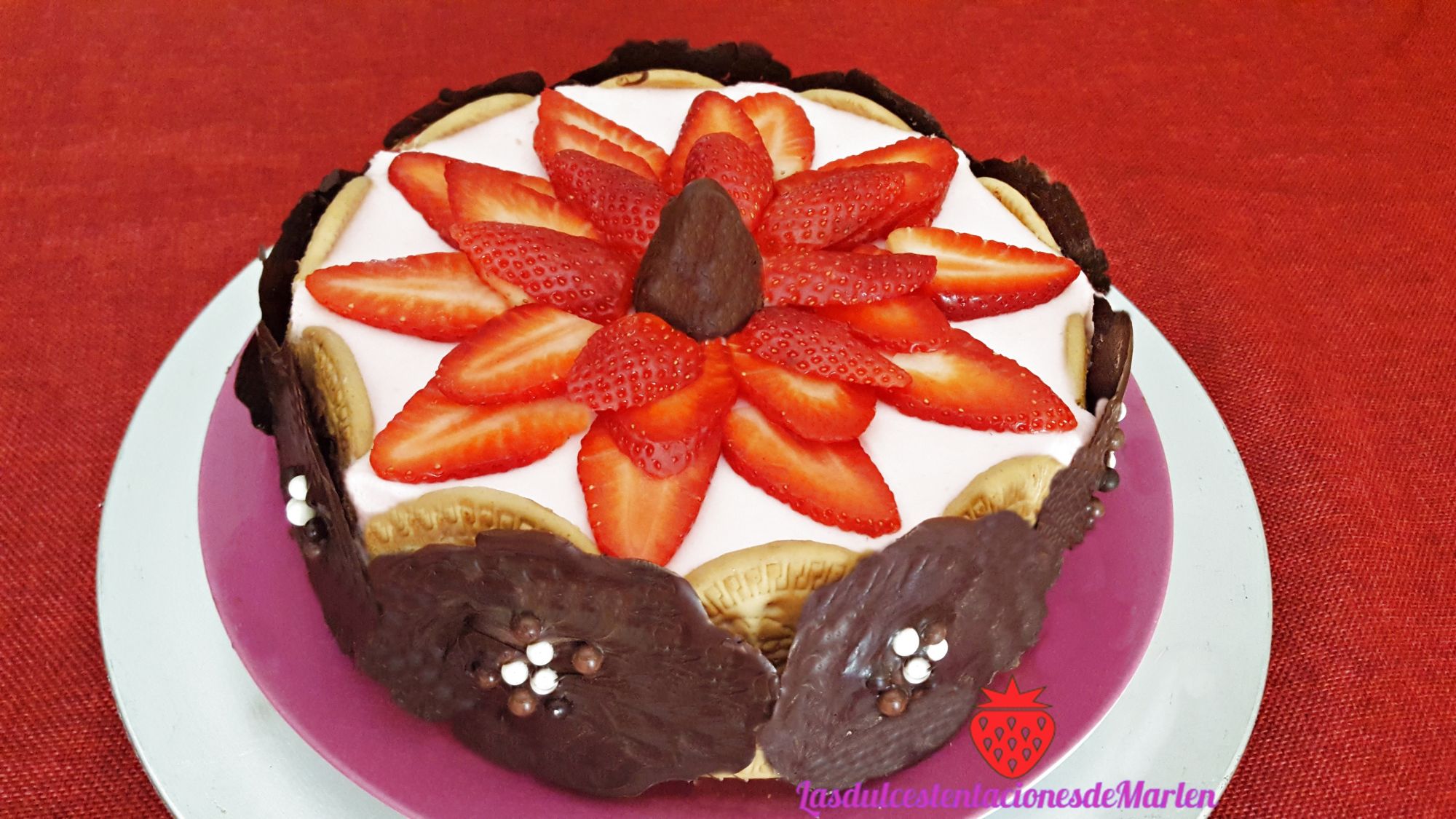 ¡Ojo! os recomiendo que utilices un molde de 24 cm. Tengo que ser sincera, se me ha quedado el molde pequeño al ser de 20 cm, y al terminar de llenarlo con la mousse de fresa me ha rebosado y se me han mojado un poco las galletas de alrededor del molde. ( quería que las dos capas tuvieran la misma altura) Para taparlas un poquito le he echo unas flores de chocolate. (pero esto es opcional )si utilizáis un molde más grande no os tiene porque pasar esto.