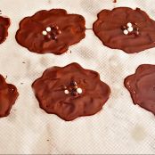 He pintado unas flores sobre la marcha en papel de horno. He derretido el chocolate negro y con una manga pastelera, he rellenado la flores y le he puesto las bolitas de tres chocolate. Las he metido en el frigo un ratito para que endurezcan y luego las he pegado sobre las galletas con el mismo chocolate derretido.