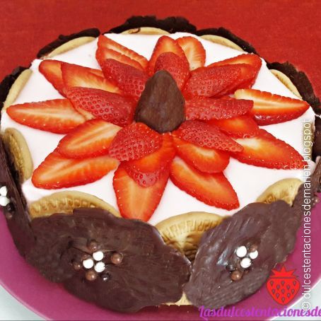 He lavado la fresas y la he cortado a laminas para ponerla de adorno sobre la tarta. La fresa del centro la he cubierto con chocolate. Mantenerla en el frigo hasta la hora de servir.