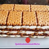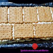 Encima del todo, lo que al desmoldar será la base, pondremos una capa de galletas pero esta vez sin mojar en leche para sea un poco más consistente. Cubriremos con papel film y dejaremos reposar en el frigo al menos unas 4-5 horas. ( a mi me gusta dejarla de un día para otro).