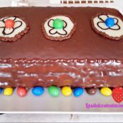 erteremos la crema de chocolate blanco y extenderemos para que quede bien repartida. ( yo al ponerla con la manga pastelera la he puesto en zigzag, así se me ha quedado la tarta más alta y para mi gusto más bonita) Cubriremos de nuevo con galletas y ahora haremos una capa de chocolate negro. Repetiremos otra capa de cada crema de chocolate intercalando con galletas mojadas en la leche. Así hasta terminarlas.