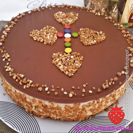 A la cobertura le he puesto también almendras crocanti ( he utilizado un molde en forma de corazón y los he rellenado con las almendras),y le he puesto unos lacasitos como veis. Quedará deliciosa elijáis la decoración que queráis!!!