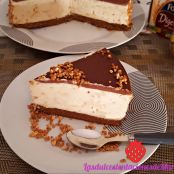 Sacamos la tarta del frigo; arañamos la base con un tenedor para que agarre mejor la cobertura de chocolate; la extendemos bien. La pasamos al frigo hasta que cuaje la cobertura, 3 horas aproximadamente.