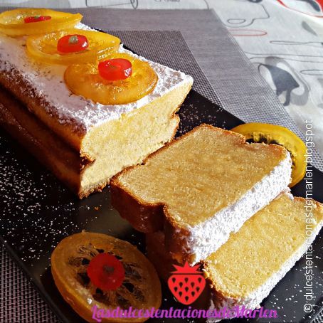 Cuando el bizcocho esté completamente frío desmoldar y espolvorear con azúcar glas, dejándola caer sobre un colador fino para que se distribuya de manera uniforme, decoramos con las rodajas de limón confitadas y las guindas.