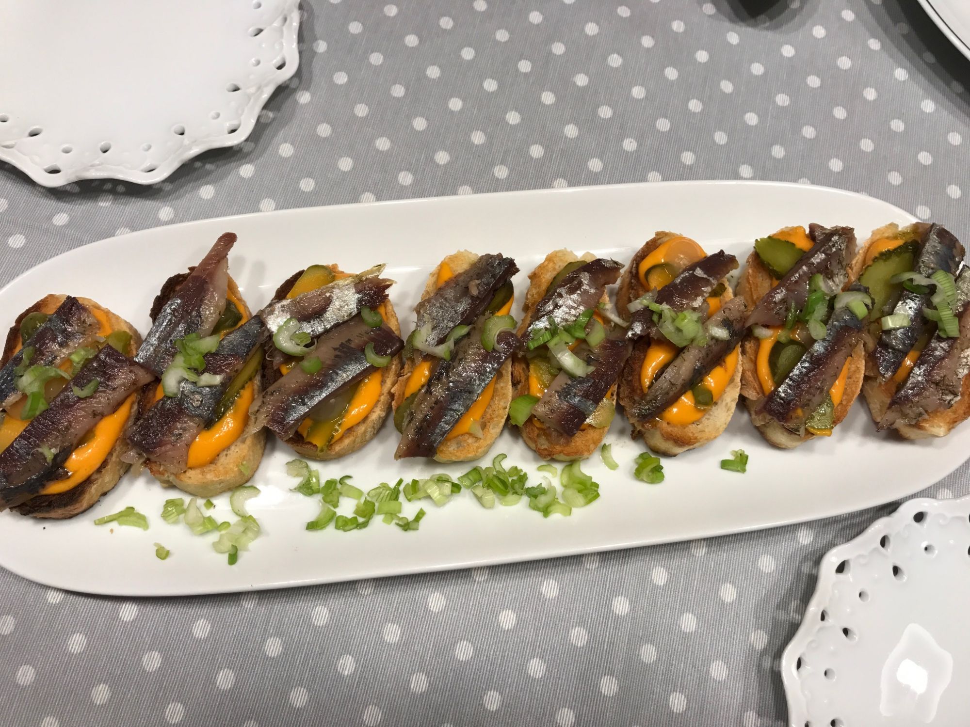 Cortamos unas rebanadas de pan y las tostamos como si fuera para desayuno, sobre estas cuando ya estén bajas de temperatura ponemos una cucharada de Salmorejo y cubrimos con láminas de pepinillo y cebollita en vinagre. Sobre esto colocamos los filetes de arenque y por último adornamos con la parte verde de la cebolleta picada (en mi caso la remojo en vinagre blanco una media hora y escurro).