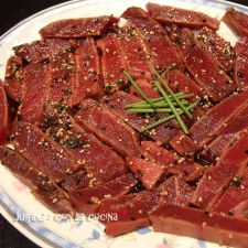 La clave del asunto es la base de Ají, si eres más de pimentón que de tomate asado cambia las proporciones. No olvides que el atún debe quedar crudo crudísimo y solo se tuesta 1/2 mm resultante de quemar la soja sobre al atún.