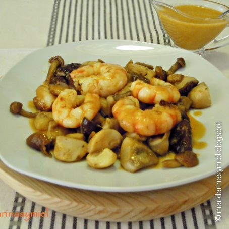 Sirve las setas en un plato, coloca por encima las colitas y riega con un poco de la salsa reservada.