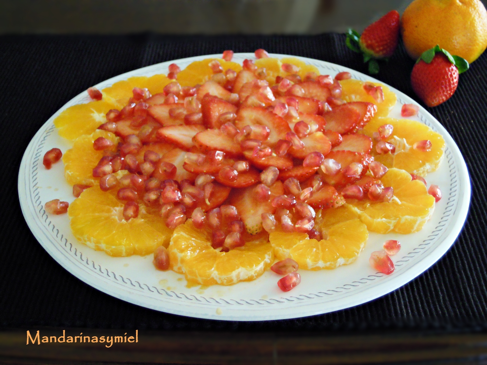 Reparte las rodajas de mandarina por un plato o fuente, pon las fresas por el centro y echa por encima la granada.