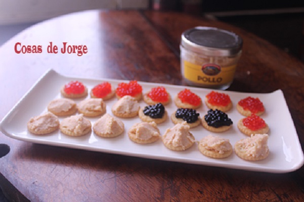 Lo ideal sería hacer 9 galletas de cada sabor, pero como era para gastar lo que había, cubrí galletitas con caviar hasta que se vaciaron los botes y complete el plato cubriendo las galletitas restantes de foie gras de pollo.