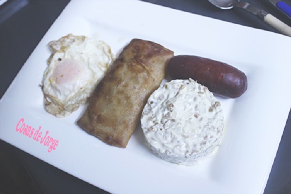 Solo nos resta colocar un huevo, el chorizo y el rollito de primavera en cada plato y retirar los aros de emplatar.