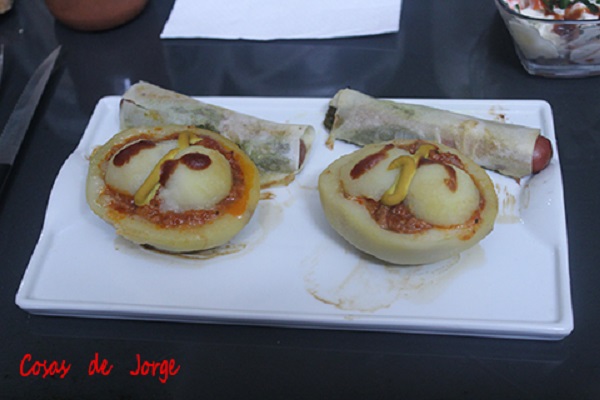 Patatas rellenas y frankfurt envuelto en pasta wonton