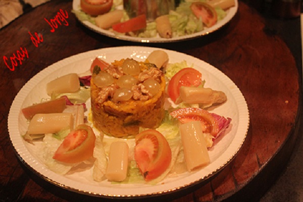 Hoy os presento un delicioso y original plato que pocos paladares han probado, se trata de un arroz con plátano y surimi, decorado de nueces y uvas, montado con un aro de emplatar sobre una base de ensalada.