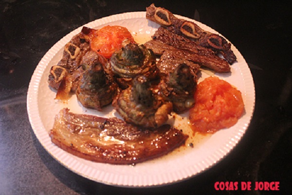 Como lo habitual es acompañar al churrasco de patatas, en esta ocasión he optado por cocinarlo junto a unas deliciosas alcachofas fritas a baja temperatura y unos tomates asados con la carne.