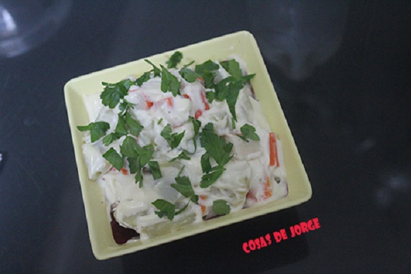 Cubrimos con la mayonesa y removemos nuevamente para que se impregne todo bien de mayonesa.