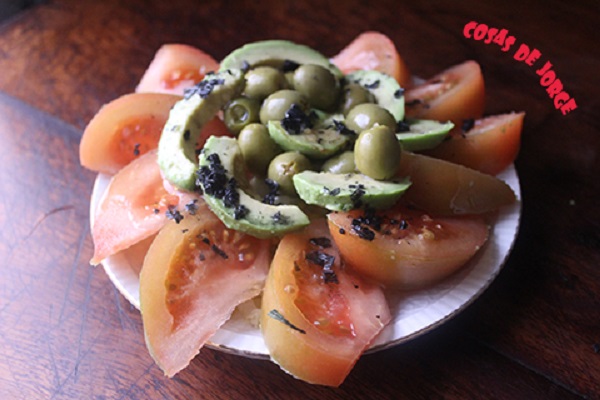 Ensalada de aguacate y tomate con sal negra