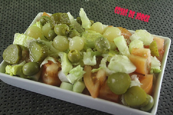 Decoramos la ensalada colocando sobre ella arbitrariamente el pepinillo, las aceitunas y las cebollitas.
