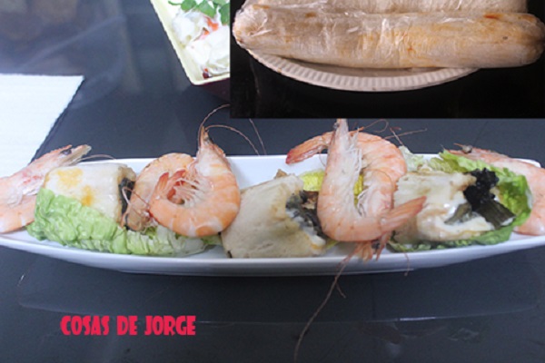 Colocamos unas hojitas de lechuga saladas y aceitadas, en el plato donde serviremos, los trocitos de rollito y decoramos con las gambas saladitas.