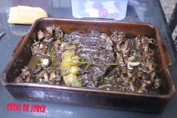 Se trata de un gigantesco filete de ternera de alrededor de un kilo de peso sin quitarle la grasita, unido a una simple bandejita de champiñones.