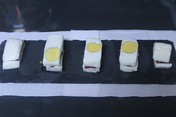 Abrimos longitudinalmente cada una de las cinco partes e introducimos entre estas dos mitades un trocito de cecina.