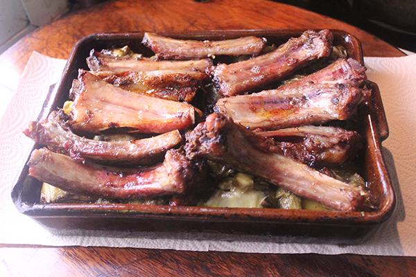 Separamos las costillas, cortando el costillar y las colocamos sobre las alcachofas.