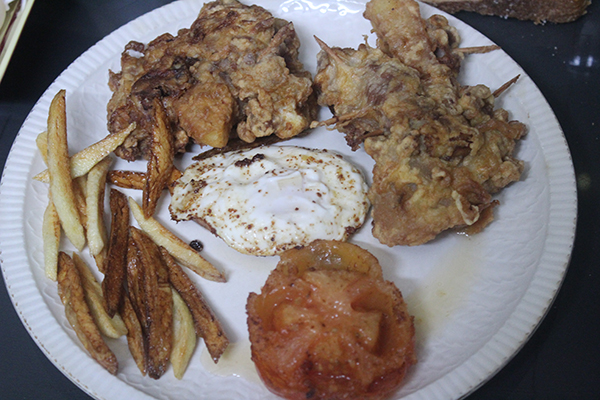 Yo freí los huevos en el aceite de freír la carne rebozada, antes de meter el tomate, os recomiendo freírlo en otra sartén para que no os quede tan feo como a mí.