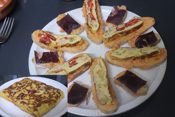Cenar con sobras es lo habitual en casa, con las sobras de un blíster de cecina (jamón de vaca), sobras de una “tortilla cuadrada de pimientos y patatas” y unas rebanadas de pan untadas de tomate, se puede preparar este espectacular plato, con muy poco trabajo.