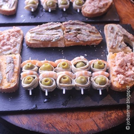 Envolvemos una aceituna con un filete de boquerón en vinagre, lo aguantamos con la ayuda de un palillo, insertamos media gamba, otra aceituna envuelta con un lomo de boquerón y terminamos con la otra mitad de gamba.