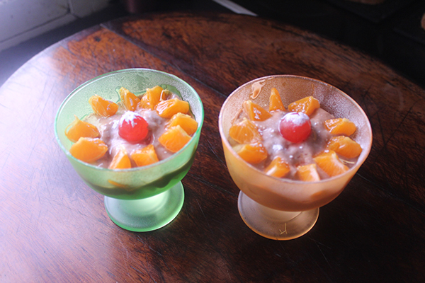 Desgranamos los medios gajos de la mandarina y los colocamos ordenaditos en ambas copas.