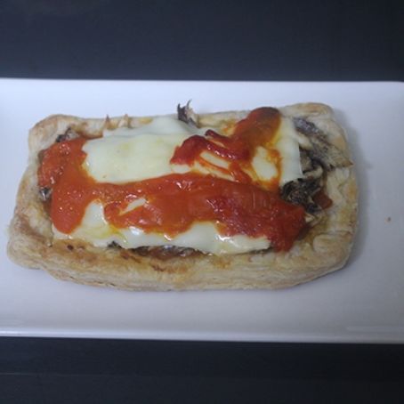 Dejamos enfriar para trabajar con comodidad, cubrimos cada rectángulo de hojaldre con pisto (si es casero mejor, pero en mi caso fue de lata, que para salir del paso sirve).