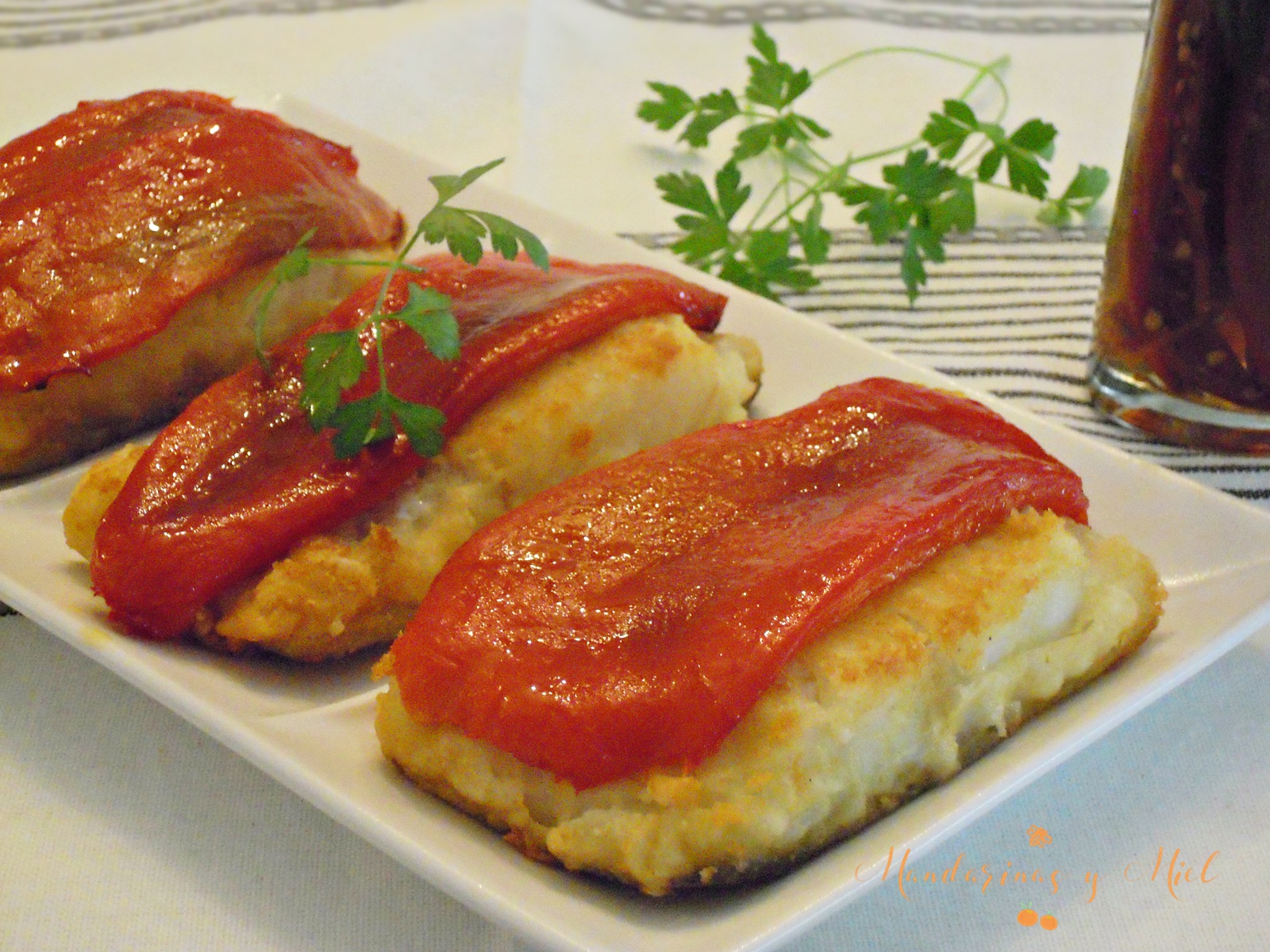 Coloca en un plato o fuente los lomos de bacalao con la piel hacia abajo y pon sobre ellos 2 o 3 trozos de pimiento asado.