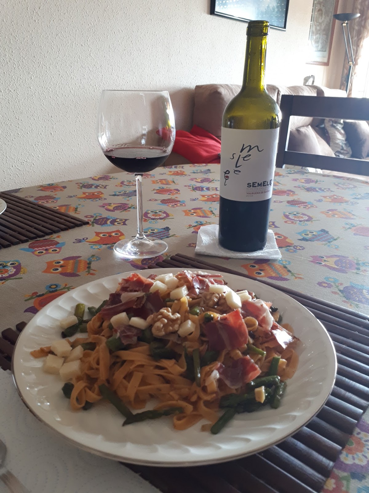 Lo ponemos en platos y a continuación por encima añadimos el jamón a tiras, el queso parmesano y dos nueces por comensal.