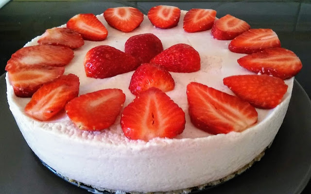 Verter en el molde la mousse y congelar tres horas. Desmoldar la tarta y decorar con fresas.