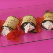 - Formamos un rectángulo de 51 x 16 cm, extendemos pesto de espinaca que lo habremos elaborado con anterioridad, enrollamos y cortamos rollitos pequeños. Al bacon le habremos quitado los bordes y envovemos cada rollito.