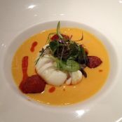 Calamar con crema de patata, alcachofas y sobrasada con miel