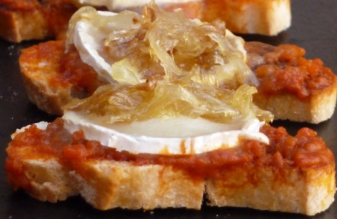 Tosta de sobrasada, rulo de cabra y cebolla confitada