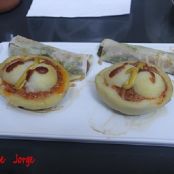 Patatas rellenas y frankfurt envuelto en pasta wonton