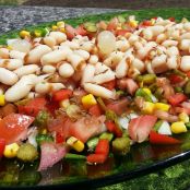 Picamos todas las verduritas en daditos, vamos montando en una fuente o ensaladera, sacamos las alubias del bote, l...