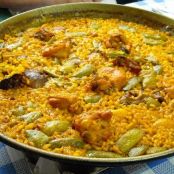 Calentamos aceite en la paella y doramos el pollo y el conejo, previamente salados